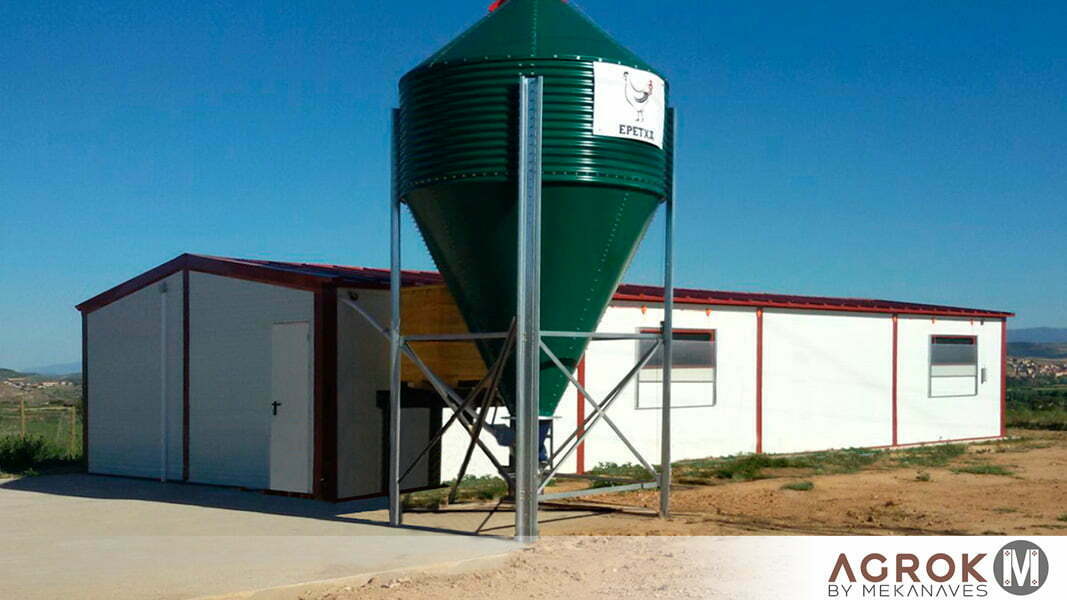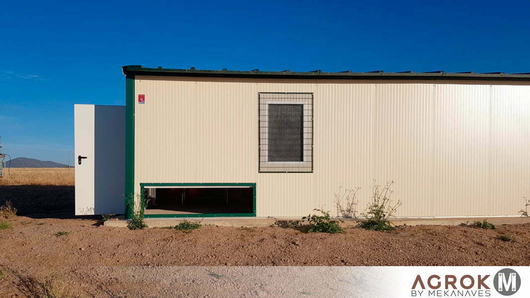 Hangars destinés à la production d’œufs écologiques, installations : poulailler pour 500 poules qui inclut les sorties au parc grâce à une petite trappe à actionner manuellement et fenêtres d’illumination et ventilation pour l’élevage, entrepôt, salle de sélection des œufs et toilettes. Tout cela est inclus dans le même hangar avicole préfabriqué. Projet conçu pour une extension ultérieure d’un deuxième poulailler aux caractéristiques similaires en phase 2.
